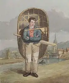 The Severn Estuary and the estuaries of the Usk and Wye were also fished using lave nets. These are Y-shaped nets consisting of a handle and two arms from which the net is hung.[47] Clenching nets are another type of net used on the Wye, these resemble a hand net which is hung at the end of a long pole.[48] Stop-nets are another type of net which are used along the Severn and Wye from boats which are anchored to withstand the force of the tide.[49] Coracle fishing also took place on the Severn, Usk and Wye but ended in the 1930s[50] The coracle used on the Usk and Wye was known as the Monmouthshire truckle and was similar in design to the Tywi coracle.[51] On the Severn, three types of coracle were used: the Ironbridge coracle, the Shrewsbury coracle and the Welshpool coracle.[52] Drift netting and seine fishing also took place on the lower, wider stretches of these three rivers, where the current is stronger.[53]