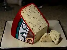 Up until the 18th century large goat herds provided milk for cheese and there has been a revival in the production of goat cheese since the twentieth century, particularly around Abergavenny. .[85] Pantysgawn Farm produces a soft goat's cheese based on an old recipe called Pantysgawn. The farm also produces St Illtyd Cheese, a mature cheese made with garlic, white wine and herbs; St David's Cheese, a continental-style washed-rind cheese; and Y Fenni cheese, a mature cheese milled with ale and mustard seeds.[86] Rees writes that Y Fenni Cheese has a tangy mustard flavour, moist texture and pale-yellow colouring. It is coated with wholegrain mustard seed and Welsh ale and preserved in a cream-coloured wax.[87] Davies refers to a recipe called Breast of Chicken filled with Y Fenni Cheese, where this cheese is used as a stuffing with parsley [88]