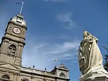 Most of the large cities in Australia that prospered during the Victorian era feature prominent statues of Queen Victoria. Sydney, the capital city of New South Wales has several. There is one statue (re-sited from the forecourt of the Irish Parliament building in Dublin) dominating the southern entrance to the Queen Victoria Building that was named in her honour in 1898. Another Sydney statue of Queen Victoria stands in the forecourt of the Federal Court of Australia building on Macquarie Street, looking across the road to a statue of her husband, inscribed "Albert the Good". In Melbourne, the capital of Victoria, the Queen Victoria Gardens named after her also features a large memorial statue in marble and granite. In Perth, capital city of Western Australia a marble statue stands in King's Park overlooking the city. In Adelaide, capital city of the state of South Australia, the Queen Victoria Square, named after her also has a large statue of her.[13] In Brisbane, capital city of the state of Queensland, there is a statue of her in Queens Square, also named for her;.[14] Ballarat, a boomtown in Victoria has a statue of Queen Victoria in the main street directly opposite its town hall. A small bust of the Queen is in the Queen Victoria Gardens in Burnt Pine, the largest town in the Australian territory of Norfolk Island.
