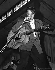 In an interview with PBS television, social historian Eric Lott said, "all the citizens' councils in the South called Elvis 'nigger music' and were terribly afraid that Elvis, white as he was, being ambiguously raced just by being working-class, was going to corrupt the youth of America."[37] Robert Kaiser says Elvis was the first who gave the people "a music that hit them where they lived, deep in their emotions, yes, even below their belts. Other singers had been doing this for generations, but they were black."[38] Therefore, his performance style was frequently criticized. Social guardians blasted anyone responsible for exposing impressionable teenagers to his "gyrating figure and suggestive gestures". The Louisville chief of police, for instance, called for a no-wiggle rule, so as to halt "any lewd, lascivious contortions that would excite the crowd".[38] Even Priscilla Presley confirms that "his performances were labeled obscene. My mother stated emphatically that he was 'a bad influence for teenage girls. He arouses things in them that shouldn't be aroused.'"[39]