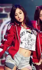 During the 2000s, it became common among young women to expose their belly buttons by rolling up their shirts similar to a crop top. During sport events such as football, the female audience apply body paints or temporary tattoos around their belly buttons.[289] In 2010, Korean girl group Rainbow's dance routine that involved lifting up their shirts to expose their navels became popular. The band stated in an interview, "We have to keep our abs in shape for the belly button dance."[290] But the routine was subsequently has been banned.[291][292][293] The SBS TV show Inkigayo told girl groups to restrain showing their skin too much and about their outfits.[294][295] In 2013, Yoona, a member of Korean girl band Girls' Generation, caused a minor controversy by revealing an exposed midriff featuring a protruding cantaloupe-like outie navel, which started a spirited discussion and polarized opinions on the Chinese-language internet.[296][297]