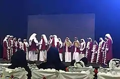 Ardah, a folkloric dance, is still practiced in Qatar.[33] The dance is performed with two rows of men opposite of one another, each of whom may or may not be wielding a sword, and is accompanied by drums and spoken poetry.[34]