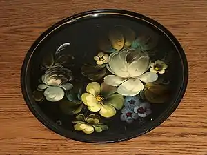 Other forms of Russian handicraft include khokhloma, Dymkovo toy, gzhel, Zhostovo painting, Filimonov toys, pisanka, Pavlovo Posad shawl, Rushnyk, and palekh.