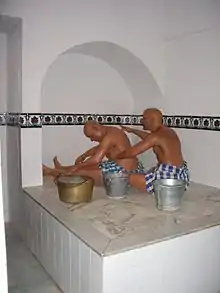 The variety of dances performed by the Tunisians probably reflects the migration flows that have traversed the country throughout the centuries. The early Phoenicians brought with them their songs and dances, whose traces can still be seen in Tunisian dance; on the other hand, the Roman occupation had little influence on Tunisian dance, especially compared to its significant architectural legacy.[56] The arrival of the Banu Hilal in the eleventh century completed the implementation of the Arab Maghreb in Tunisia, introducing the traditions, music and dance of the nomads of Upper Egypt.[57] Religious dances were influenced by Sufism, but by the end of the 15th century they were increasingly subject to the influence of Andalusian dance and urban music. The time at which Oriental dance arrived in Tunisia is disputed: it is generally believed to have arrived at a later date with the Ottomans, but some experts in the history of North African art have said it was brought to Tunisia by the first Turkish corsairs in the sixteenth century, and others claim that it originated even earlier, founded by the early Phoenicians during the era of matriarchy in Mesopotamia.[58] Characteristic features of oriental dance as performed in Tunisia include the rhythmic movements of the pelvis, movement highlighted by the elevation of the arms to horizontal, and feet moving in rhythm and transferring weight onto the right or left leg.[59]