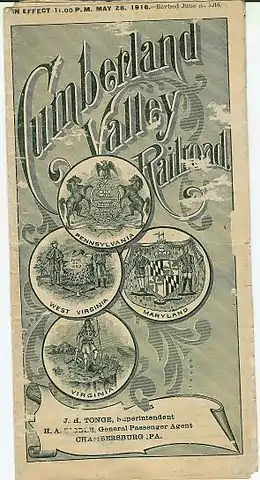 During the American Civil War the line had strategic importance in supplying Union troops in the Shenandoah Valley. It also ran the first passenger sleeping car in the U.S. on the Chambersburg-Harrisburg route in 1839.[4][5] The Pennsylvania Railroad (PRR) gained control of the CVRR as early as 1859, and officially purchased it on June 2, 1919. The PRR's successor, the Penn Central, closed all railway facilities in Chambersburg in 1972 and its successor, Conrail, abandoned major pieces of the line in 1981.