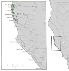 Mendocino cypress occurs in very limited ranges within only Mendocino County, on some of the historical lands of the Yuki Native American people. In Mendocino County the occurrence is in a discontinuous coastal terrace strip, primarily as a pygmy forest associated with bishop pine (Pinus muricata) and Mendocino shore pine (P. contorta var. bolanderi). Occurrences are typically below 500 m in elevation.[11] The Mendocino County official soils survey states that "While not formally recognized as a major forest cover type, the coastal portion of the survey area also includes bishop pine and Mendocino cypress (pygmy) forest types".[13]