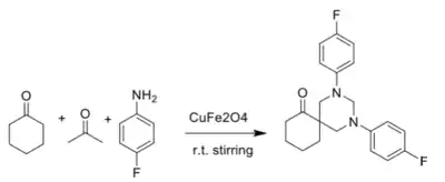 Nano CuFe2O4 was utilized as a catalyst in one-pot synthesis of fluorine containing spirohexahydropyrimidine derivatives. It was also observed that the catalyst can be reused five times without significant loss in catalytic activity after each runs. In the reaction, iron plays a vital role in coordination with carbonyl group in order to increase the electrophilic property, which can facilitate the reaction condition and increase reaction rate.[20]