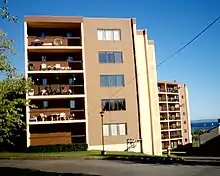 Development of Current River began after World War II, and many homes in the neighbourhood are "Victory Homes", a post-war building style that allowed fast manufacture of single-family dwellings. Development in the neighbourhood progressed northward, and as one travels further north Victory Homes become less common, being replaced with more contemporary building styles. A small cluster of highrise apartments is located beside an outcrop of the Canadian Shield in the southernmost portion of the residential neighbourhood, and offers its residents a view of the Current River Greenway and Thunder Bay.