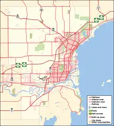 The municipally operated Strathcona Golf Course is located to the east of Current River, and is an 18-hole, 72-par course.[3] Centennial Park, a recreation of a 20th century logging camp, is located northwest of the neighbourhood. The Terry Fox Memorial and Lookout is northeast of the neighbourhood, located along Highway 11/17. It commemorates Terry Fox's Marathon of Hope and offers panoramic views of the lake.