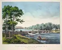 Currier and Ives was a successful American printmaking firm based in New York City from 1835 to 1907 headed first by Nathaniel Currier, and later jointly with his partner James Merritt Ives. The prolific firm produced prints from paintings by fine artists as black and white lithographs that were hand colored. Lithographic prints could be reproduced quickly and purchased inexpensively, and the firm called itself "the Grand Central Depot for Cheap and Popular Prints" and advertised its lithographs as "colored engravings for the people".[1] The firm adopted the name "Currier and Ives" in 1857.