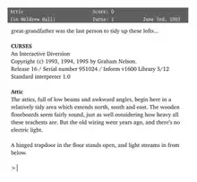 Curses is an interactive fiction computer game created by Graham Nelson in 1993. Appearing in the beginning of the non-commercial era of interactive fiction, it is considered one of the milestones of the genre.