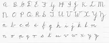 Today there is no standardized teaching script stipulated in the various national curriculums for schools in the United Kingdom, only that one font style needs to be used consistently throughout the school.[10] In both the Cursive and the Continuous Cursive writing styles, letters are created through joining lines and curve shapes in a particular way. Once pupils have learnt how to clearly form single letters, they are taught how single letters can be joined to form a flowing script.[11]