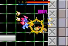 Unlike other Custom Robo titles, once shot out of the Robocannon, players have a random amount of time for their Custom Robo to be ready to battle, instead of depending on which six sides of the cube they land on. Custom Robos are arranged in groups that are similar to their abilities. In camera views, unlike other Custom Robo titles, this one has only one, which zooms out whenever two Custom Robos are far from each other, while it zooms in whenever they are close to each other. The endurance bar is located above the players' hit points. Once it runs out, the players' robo gets "downed" which means that it stays fallen for a couple seconds. After it gets up, it goes into "rebirth", where it stays invincible for about 3 seconds. If the player repeatedly loses the same battle, the game offers the option of reducing the opponent's initial health, to make it easier. If the players continue to lose several times, the degree of handicap offered increases up to 75%, giving the opponent a starting 250 HP.