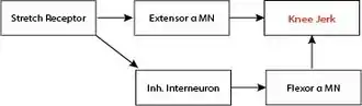 Reflexes can be very simple, as in the monosynaptic reflex, which only contains one synapse, or more complicated, as in the polysynaptic reflex, which involves more than one synapse. The knee jerk reflex is a common example of a monosynaptic reflex when one is looking at the quadriceps motor response of kicking your leg out. It can also be used as an example of a polysynaptic reflex when looking at the involvement of inhibitory interneurons to relax the hamstrings. The complexity of the reflex can be estimated by examining the time delay, or latency, between the electrical stimulation of the sensory neuron and the corresponding motor response, as measured by EMG (electromyography). Most reflexes can be categorized in one of three groups depending on the latency of EMG response. The short-latency reflex (SLR) is the fastest (~40-50 ms) and involves a mono-synaptic pathway. The medium-latency reflex (MLR) utilizes interneurons within the spinal cord and is typically ~80-90 ms. The long-latency reflex (LLR) is ~120-140 ms, suggesting that it is mediated by additional supraspinal input from the brain.[1]