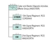 As part of the Army 2020 and subsequently Army 2020 Refine programmes, the 14th Signal Regiment (Electronic Warfare) under control of the 1st Intelligence, Surveillance and Reconnaissance Brigade (6th (UK) Division), while the 13th Signal Regiment was formed in June 2020 under 1st (UK) Signal Brigade (6th (UK) Division) as the first dedicated cyber unit.[1] The last regiment, 21st Signal Regiment was under 7th Signal Group, part of 11th Signal Brigade and Headquarters West Midlands (1st (UK) Division, later 3rd (UK) Division). However, under the Future Soldier programme, these three units will be grouped together into a new Colonel's command (Group) and become the "Cyber and Electro Magnetic Activities Effects Group".[2][3]