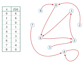 The figure shows a function f that maps the set S = {0,1,2,3,4,5,6,7,8} to itself. If one starts from x0 = 2 and repeatedly applies f, one sees the sequence of values