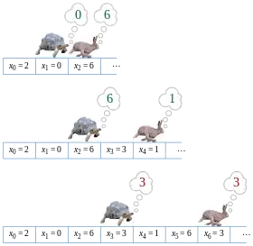 The algorithm thus maintains two pointers into the given sequence, one (the tortoise) at xi, and the other (the hare) at x2i. At each step of the algorithm, it increases i by one, moving the tortoise one step forward and the hare two steps forward in the sequence, and then compares the sequence values at these two pointers. The smallest value of i > 0 for which the tortoise and hare point to equal values is the desired value ν.