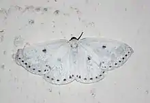Adults are white, the wings without any transverse markings. The forewings have a discal spot below and the hindwings have a large black spot at the end of the cell. Both wings have a submarginal row of prominent round black spots and a row of indistinct black dots between it and the margin.[3]