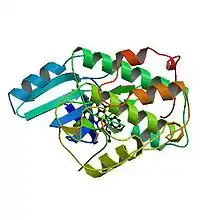 Cyclin-dependent kinase 1 also known as CDK1 or cell division cycle protein 2 homolog is a highly conserved protein that functions as a serine/threonine protein kinase, and is a key player in cell cycle regulation.[5] It has been highly studied in the budding yeast S. cerevisiae, and the fission yeast S. pombe, where it is encoded by genes cdc28 and cdc2, respectively.[6] In humans, Cdk1 is encoded by the CDC2 gene.[7] With its cyclin partners, Cdk1 forms complexes that phosphorylate a variety of target substrates (over 75 have been identified in budding yeast); phosphorylation of these proteins leads to cell cycle progression.[8]