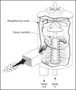 Generally, the inlet gas enters the chamber tangentially, swirls through the chamber in a corkscrew motion, and exits. At the same time, liquid is sprayed inside the chamber. As the gas swirls around the chamber, pollutants are removed when they impact on liquid droplets, are thrown to the walls, and washed back down and out.