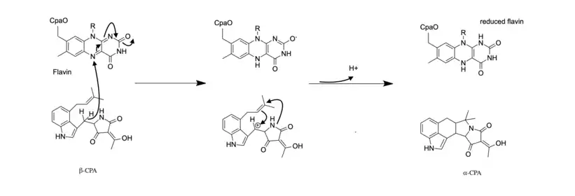 Three enzymes are utilized in the biosynthesis of α-CPA: the polypeptide CpaS, dimethylallyltransferase (CpaD), and flavoprotein oxidocyclase (CpaO).[3] CpaS is the first enzyme in the biosynthetic pathway and is a hybrid polyketide synthase- nonribosomal peptide synthetase (PKS-NRPS). It uses the precursors acetyl-CoA, malonyl-CoA, and tryptophan to produce cyclo-acetoaceytl-L-tryptophan (cAATrp).[3] The intermediate cAATrp is then prenylated with dimethylallyl pyrophosphate (DMAPP) by the enzyme CpaD to form the intermediate β-CPA. CpaD has high substrate specificity and will not catalyze prenylation in the presence of DMAPP’s isomer isopentyl pyrophosphate (IPP) or the derivatives of cAATrp.[2] The third enzyme, CpaO, then acts on β-CPA through a redox mechanism that allows for intramolecular cyclization to form α-CPA.[3]