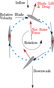 Cyclorotors can produce lift and thrust at high advance ratios, which, in theory, would enable a cyclogyro aircraft to fly at subsonic speeds well exceeding those of single rotor helicopters. Single rotor helicopters are limited in forward speed by a combination of retreating blade stall and sonic blade tip constraints.[7] As helicopters fly forward, the tip of the advancing blade experiences a wind velocity that is the sum of the helicopter forward speed and rotor rotational speed. This value cannot exceed the speed of sound if the rotor is to be efficient and quiet. Slowing the rotor rotational speed avoids this problem, but presents another. In the traditional method of the composition of velocity it is easy to understand that the velocity experienced by the retreating blade has a value that is produced by the vector composition of the velocity of blade rotation and the freestream velocity. In this condition it is evident that in presence of a sufficiently high advance ratio the velocity of air on the retreating blade is low. The flapping movement of the blade changes the angle of attack. It is then possible for the blade to reach the stall condition.[8] In this case it is necessary that the stalling blade increases the pitch angle to keep some lift capability. This risk puts constraints on the design of the system. An accurate choice of the wing profile is necessary and careful dimensioning of the radius of the rotor for the specified speed range.[9] Slow speed cyclorotors bypass this problem through a horizontal axis of rotation and operating at a comparatively low blade tip speed. For higher speeds, which may become necessary for industrial applications, it seems necessary to adopt more sophisticated strategies and solutions. A solution is the independent actuation of the blades which have been recently patented and successfully tested for naval use [10] by use on hydraulic actuation system. The horizontal axis of rotation always provides an advancement of the upper blades, that produce always a positive lift by the full rotor.[11] These characteristics could help overcome two issues of helicopters: their low energy efficiency and the advance ratio limitation.[12][13][14]