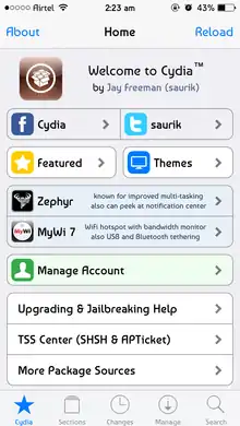 Cydia is a graphical user interface of APT(Advanced Package Manager) for iOS. It enables a user to find and install software not authorized by Apple on jailbroken iPhones, iPads and iPod Touch devices. It also refers to digital distribution platform for software on iOS accessed through Cydia software.[2] Most of the software packages available through Cydia are free of charge, although some require purchasing.