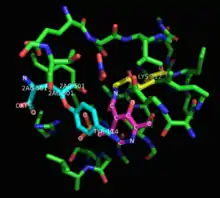 Inhibited cystathionase active site.[2] The inhibitor and Tyr114 are in light blue, PLP in purple, and Lys121 in yellow.