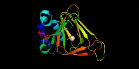 Cysteine dioxygenase (CDO) is a non-heme iron enzyme that catalyzes the conversion of L-cysteine to cysteine sulfinic acid (cysteine sulfinate). CDO plays an important role in cysteine catabolism, regulating intracellular levels of cysteine and responding changes in cysteine availability.[1] As such, CDO is highly regulated and undergoes large changes in concentration and efficiency. It oxidizes cysteine to the corresponding sulfinic acid by activation of dioxygen, although the exact mechanism of the reaction is still unclear. In addition to being found in mammals, CDO also exists in some yeast and bacteria, although the exact function is still unknown.[2][3] CDO has been implicated in various neurodegenerative diseases and cancers, which is likely related to cysteine toxicity.[1][2]