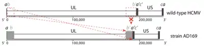 Class E genome of HCMV. The unique long and unique short regions are indicated as UL and US. Repeat regions are indicated as a, b and c sequences, where primes designate inverted orientations. Sequences ab and b′a′ correspond to the terminal/internal repeat long (TRL/IRL); sequences a′c′ and ca correspond to the internal/terminal repeat short (IRS/TRS). Top: typical genome arrangement of wild-type strains; bottom: genome arrangement of strain AD169, a laboratory-adapted strain. Genome rearrangements that have occurred during extensive passaging are indicated in red between the wild-type and laboratory-adapted configurations.[13]
