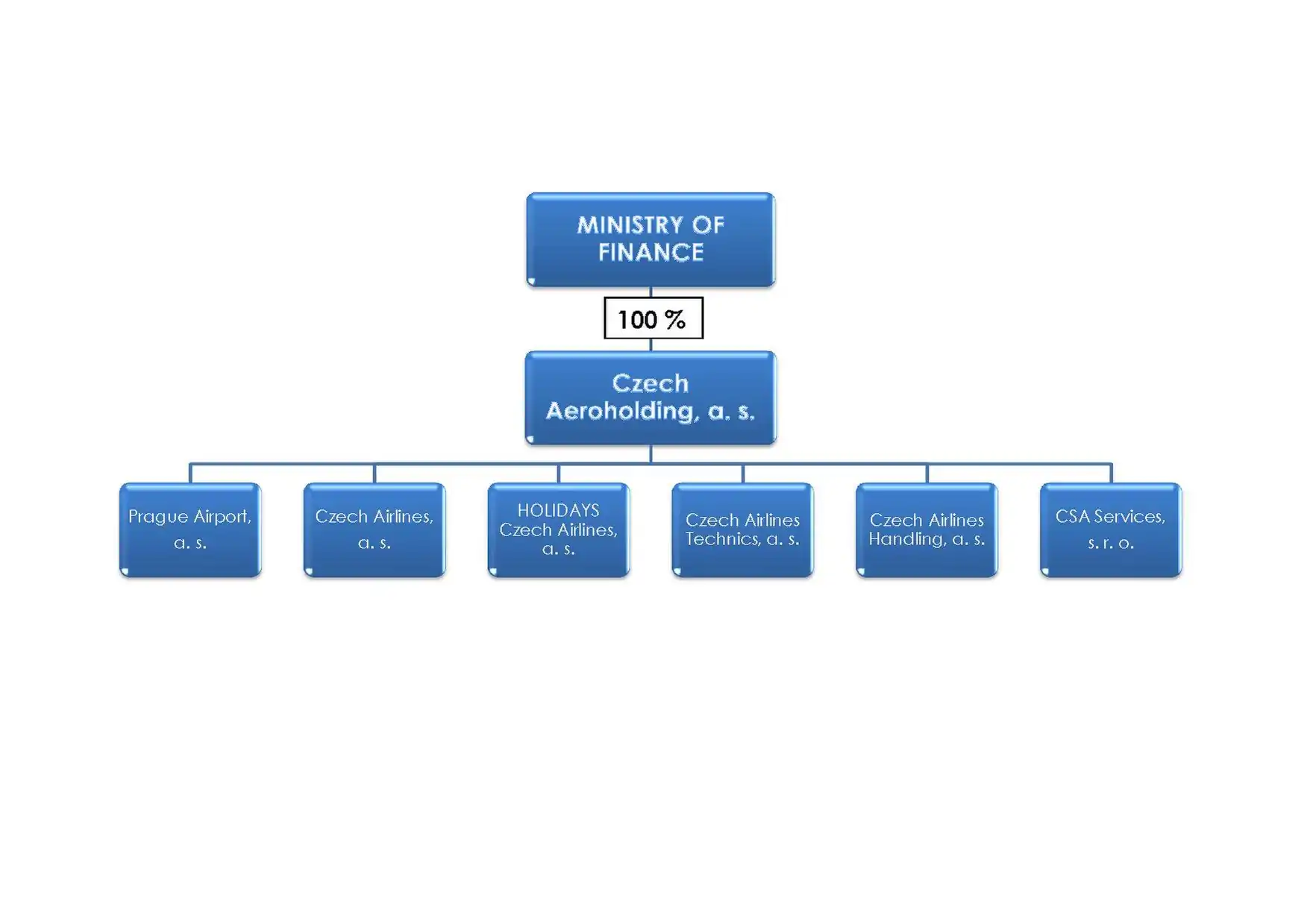 - August 2012 - An agreement on the deposit of Czech Airlines, Inc. shares into Czech Aeroholding, Inc. was signed. Czech Aeroholding, Inc. thus became the majority shareholder of Czech Airlines, replacing the Ministry of Finance of the Czech Republic.