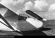 The Cw 5.bis had a single spar, high mounted gull wing with an aspect ratio of 18, very high for the 1930s. It was covered with plywood ahead of the spar, forming a D-box, and with fabric behind. Only the inner part, about a quarter of the span, carried dihedral. Out to half span the wing had a rectangular plan but beyond this long, curved ailerons, mounted at an angle to the centre-line, narrowed the chord to fine tips. The wing was braced by V-struts from the lower fuselage to the spar and false spar of the central section.[1][2]