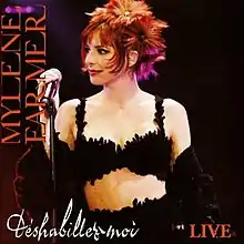 The song was performed during the 1989 and 2006 tours. During one live performance of the song in 1989, Farmer sang with a microphone on a base, and sometimes she pretended to laugh. She wore a restrictive black dress with sleeves that greatly limited her arm movement, effectively a bondage dress.[11] The dress made her unable to undress herself, which explains why she wore it for the song whose title would be translated to English as "undress me". This is only known occasion of Farmer wearing something like that, which was clearly intended to be funny.[12] After a last "Déshabillez-vous !" launched and an explosion of fireworks, a total blackout enabled the singer to leave the stage to take off her dress. According to Florence Rajon, "we may be disappointed by the coldness of the performance, but this song "remains one of the highlights of the concert".[13] About the 2006 live version, author Erwan Chuberre considered the performance as being "energic" and "more rock", adding that "Farmer let herself loose on this song", performing it in a "dynamic, mischievous and playful" way;[6] however, on some shows, she forgot a verse of the song.[14]