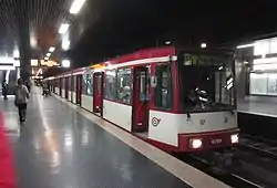 The Düsseldorf Stadtbahn, together with the Rhine-Ruhr S-Bahn and the Düsseldorf Straßenbahn (Tram), is the backbone of the public transport system of Düsseldorf, Germany, and is integrated in the Rhine-Ruhr Stadtbahn network. The Stadtbahn officially opened on 6 August 1988 and is operated by Rheinbahn AG. As of 2016, the Stadtbahn network currently consists of eleven lines,[1] operating on 68.5 kilometres (42.6 mi),[1] and serving 161 stations, 22 of which are underground stations (Duesseldorf: 16, Duisburg: 6 (U79)).[1]