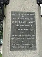 Don Stephen Senanayake (Sinhala: දොන් ස්ටීවන් සේනානායක,; Tamil: டி. எஸ். சேனநாயக்கா; 21 October 1884 – 22 March 1952) was a Ceylonese statesman. He was the first Prime Minister of Ceylon having emerged as the leader of the Sri Lankan independence movement that led to the establishment of self-rule in Ceylon. He is considered as the "Father of the Nation".[3]