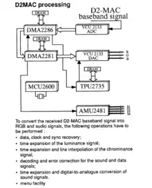 D2-MAC is a satellite television transmission standard, a member of Multiplexed Analogue Components family.[1] It was created to solve D-MAC's bandwidth problem on European cable systems.
