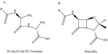 β-lactams exert their effect by competitively inactivating the serine DD-transpeptidase catalytic site. Penicillin is a cyclic analogue of the D-Ala-D-Ala terminated carbonyl donors, therefore in the presence of this antibiotic, the reaction stops at the level of the serine ester-linked penicilloyl enzyme.[11] Thus β-lactam antibiotics force these enzymes to behave like penicillin binding proteins.[12]