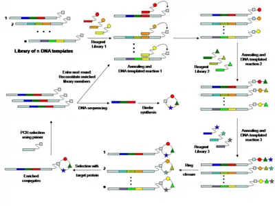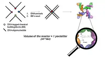 In 2001 David Liu and co-workers showed that complementary DNA oligonucleotides can be used to assist certain synthetic reactions, which do not efficiently take place in solution at low concentration.[23][24] A DNA-heteroduplex was used to accelerate the reaction between chemical moieties displayed at the extremities of the two DNA strands. Furthermore, the "proximity effect", which accelerates bimolecular reaction, was shown to be distance-independent (at least within a distance of 30 nucleotides).[23][24] In a sequence-programmed fashion oligonucleotides carrying one chemical reactant group were hybridized to complementary oligonucleotide derivatives carrying a different reactive chemical group. The proximity conferred by the DNA hybridization drastically increases the effective molarity of the reaction reagents attached to the oligonucleotides, enabling the desired reaction to occur even in an aqueous environment at concentrations which are several orders of magnitude lower than those needed for the corresponding conventional organic reaction not DNA-templated.[25] Using a DNA-templated set-up and sequence-programmed synthesis Liu and co-workers generated a 64-member compound DNA encoded library of macrocycles.[26]