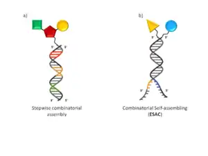 Encoded Self-Assembling Chemical (ESAC) libraries rely on the principle that two sublibraries of a size of x members (e.g. 103) containing a constant complementary hybridization domain can yield a combinatorial DNA-duplex library after hybridization with a complexity of x2 uniformly represented library members (e.g. 106).[17] Each sub-library member would consist of an oligonucleotide containing a variable, coding region flanked by a constant DNA sequence, carrying a suitable chemical modification at the oligonucleotide extremity.[17] The ESAC sublibraries can be used in at least four different embodiments.[17]