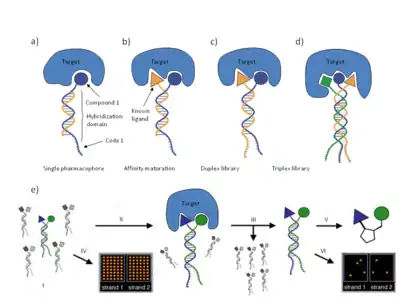 The beginning of the millennium saw the introduction of several independent developments in DEL technology. These technologies can be classified under two general categories: non-evolution-based and evolution-based DEL technologies capable of molecular evolution. The first category benefits from the ability to use off the shelf reagents and therefore enables rather straightforward library generation. Hits can be identified by DNA sequencing, however DNA translation and therefore molecular evolution is not feasible by these methods. The split and pool approaches developed by researchers at Praecis Pharmaceuticals (now owned by GlaxoSmithKline), Nuevolution (Copenhagen, Denmark) and ESAC technology developed in the laboratory of Prof D. Neri (Institute of Pharmaceutical Science, Zurich, Switzerland) fall under this category. ESAC technology sets itself apart being a combinatorial self-assembling approach which resembles fragment based hit discovery (Fig 1b). Here DNA annealing enables discrete building block combinations to be sampled, but no chemical reaction takes place between them. Examples of evolution-based DEL technologies are DNA-routing developed by Prof. D.R. Halpin and Prof. P.B. Harbury (Stanford University, Stanford, CA), DNA-templated synthesis developed by Prof. D. Liu (Harvard University, Cambridge, MA) and commercialized by Ensemble Therapeutics (Cambridge, MA) and YoctoReactor technology.[9] developed and commercialized by Vipergen (Copenhagen, Denmark). These technologies are described in further detail below. DNA-templated synthesis and YoctoReactor technology require the prior conjugation of chemical building blocks (BB) to a DNA oligonucleotide tag before library assembly, therefore more upfront work is required before library assembly. Furthermore, the DNA tagged BBs enable the generation of a genetic code for synthesized compounds and artificial translation of the genetic code is possible: That is the BB's can be recalled by the PCR-amplified genetic code, and the library compounds can be regenerated. This, in turn, enables the principle of Darwinian natural selection and evolution to be applied to small molecule selection in direct analogy to biological display systems; through rounds of selection, amplification and translation.