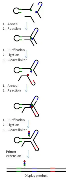 In order to apply combinatorial chemistry for the synthesis of DNA-encoded chemical libraries, a Split-&-Pool approach was pursued.[10][11] Initially a set of unique DNA-oligonucleotides (n) each containing a specific coding sequence is chemically conjugated to a corresponding set of small organic molecules. Consequently, the oligonucleotide-conjugate compounds are mixed ("Pool") and divided ("Split") into a number of groups (m). In appropriate conditions a second set of building blocks (m) are coupled to the first one and a further oligonucleotide which is coding for the second modification is enzymatically introduced before mixing again. This “split-&-pool” steps can be iterated a number of times (r) increasing at each round the library size in a combinatorial manner (i.e. (n x m)r). Alternatively, peptide nucleic acids have been used to encode libraries prepared by "split-&-pool" method.[13] A benefit of PNA-encoding is that the chemistry can be performed by standard SPPS.[14]