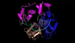 Besides its catalytic polymerase domain, pol λ has an 8 kDa domain and a BRCT domain. The 8 kDa domain has lyase activity that can remove a 5' deoxyribosephosphate group from the end of a strand break.[13] The BRCT domain is a phosphopeptide binding domain that is common among DNA repair proteins and is likely involved in coordinating protein-protein interactions.[14] Pol λ is structurally and functionally related to pol μ, another member of the X family that also participates in non-homologous end joining.[15] Like pol μ, pol λ participates in V(D)J recombination, the process by which B-cell and T-cell receptor diversity is generated in the vertebrate immune system. Whereas pol μ is important for heavy-chain rearrangements, pol λ seems to be more important for light-chain rearrangements.[16][17] The yeast Saccharomyces cerevisiae has a single homolog of both pol λ and pol μ called Pol4.[18]