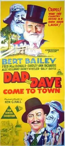 Dad and Dave Come to Town is a 1938 Australian comedy film directed by Ken G. Hall, the third in the 'Dad and Dave' comedy series starring Bert Bailey. It was the feature film debut of Peter Finch and is one of the best known Australian films of the 1930s.[4]