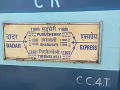 The 11021 / 11022 Dadar Terminus–Tirunelveli Chalukya Express is an express train of the Indian Railways connecting Tirunelveli Junction in Tamil Nadu and Dadar Terminus of Mumbai, Maharashtra. It is currently being operated as 11021/11022 train numbers on tri-weekly basis.[1][2]