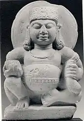 Yijing then relates an anecdote about how the deity once miraculously provided food for five hundred monks who came to visit the monastery of Makuṭabandhana in Kushinagar after one of the female servants prayed and made offerings before his image.[15] This idea of Mahākāla as one who brought prosperity to monasteries and granted wishes may have contributed to the identification of the deity as a god of wealth and fortune in Japan.[14]