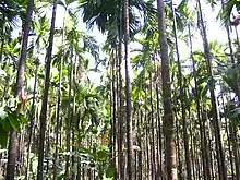 The topography of the district is plain up to 30 km (18.64 mi) inside the coast and changes to undulating hilly terrain sharply towards the east in the Western Ghats.[23] Teak, bamboo and rosewood trees are found in the hilly areas towards the east.[24] The Geological Survey of India has identified this district as a moderately earthquake-prone region and categorised it in the Seismic III Zone.[25] In rural Dakshina Kannada, houses are in the midst of a farm field or plantations of coconut or arecanut, separated by a few hundred metres.[26]