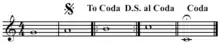 - D.S. al coda musician to go back to the sign, and when Al coda or To coda is reached jump to the coda symbol.