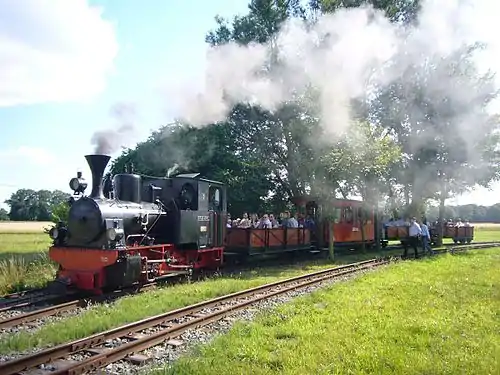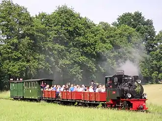 The railways rolling stock consists mainly of wagons and coaches formerly used at the "Muskau Forest Railway" (WEM) and the "Mecklenburg-Pomeranian Narrow Gauge Railway" (MPSB), both run by the former East German state railways, Deutsche Reichsbahn. They were either sourced directly from the WEM or via Berlins Children's Railway. The Locomotives include small industrial and larger light railway steam locomotives. The railway has also gathered an interesting collection of large diesel locomotives over the years. In the summer months the mainstay of coaches are of the open type used during the First World War by the German army and were last in use on the WEM. The closed passenger coaches consist of some self built vehicles and two former MPSB coaches, there are also two former MPSB guards vans.[1]