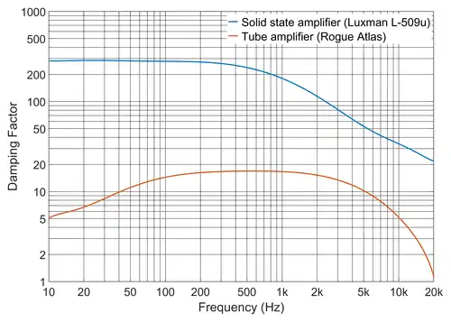 In typical solid state and tube amplifiers, the damping factor varies as a function of frequency. In solid state amplifiers, the damping factor usually has a maximum value at low frequencies, and it reduces progressively at higher frequencies. The figure to the right shows the damping factor of two amplifiers. One is a solid state amplifier (Luxman L-509u) and the other is a tube amplifier (Rogue Atlas). These results are fairly typical of these two types of amplifiers, and they serve to illustrate the fact that tube amplifiers usually have much lower damping factors than modern solid state amplifiers, which is an undesirable characteristic.