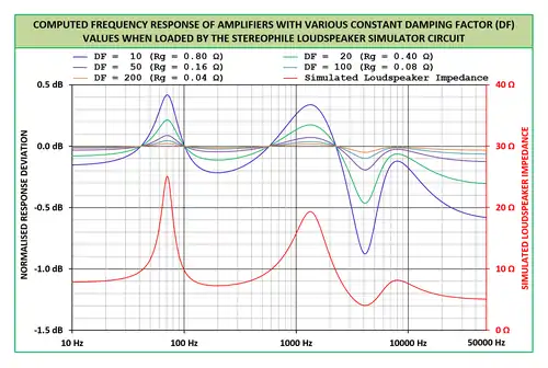 Although extremely high values of damping factor in an amplifier will not necessarily make the loudspeaker–amplifier combination sound better,[4] a high damping factor can serve to reduce the intensity of added frequency response variations that are undesirable. The figure on the right shows the effect of damping factor on the frequency response of an amplifier when that amplifier is connected to a simulated loudspeaker impedance load. This load is moderately demanding but not untypical of high-fidelity loudspeakers that are on the market, and it is based on the circuit proposed by Atkinson.[5] Stereophile have recognised the importance of amplifier damping factor, and have made the use of the simulated loudspeaker load a routine part of their measurements of amplifiers. At around 4 kHz, the real-life difference between an amplifier with a moderate (100) damping factor and one with a low (20) damping factor is about 0.37 dB. Keep in mind though, that the amplifier with the low damping factor is acting more like a graphic equaliser than is the amplifier with the moderate damping factor.